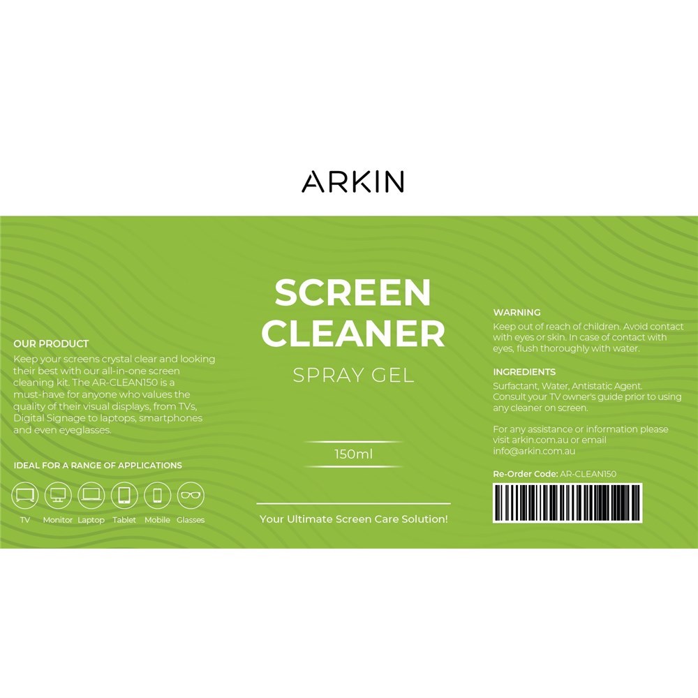 • The AR-CLEAN150 is a must-have for anyone who values the quality of their visual displays, from TVs, Digital Signage to laptops, smartphones and even eyeglasses.