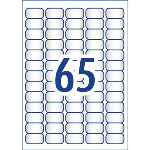 • Size: 38.1x21.2mm 1625 labels, 25 sheets. 65 labels per sheet (65UP).