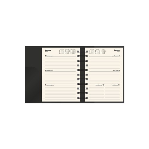 • Pen loop, lay flat opening, ribbon marker and week to view layout.