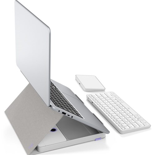 • One compact kit with a wireless keyboard, wireless touchpad and a book-like case that transforms into a laptop stand.