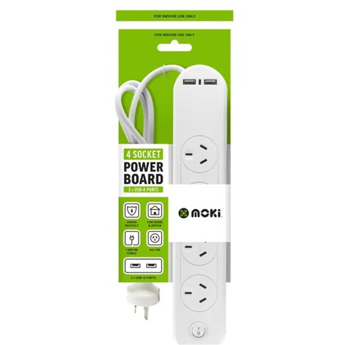 Moki 4 Outlet Powerboard With 2 USB-A Ports And Surge Overload Protection White