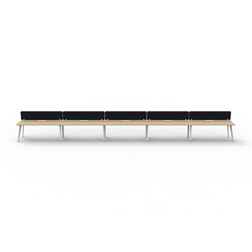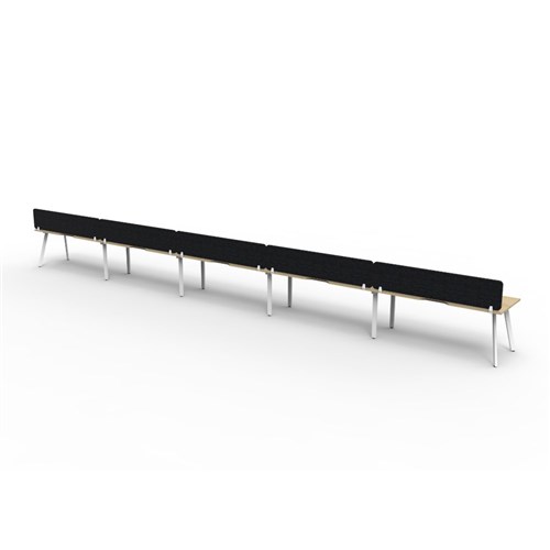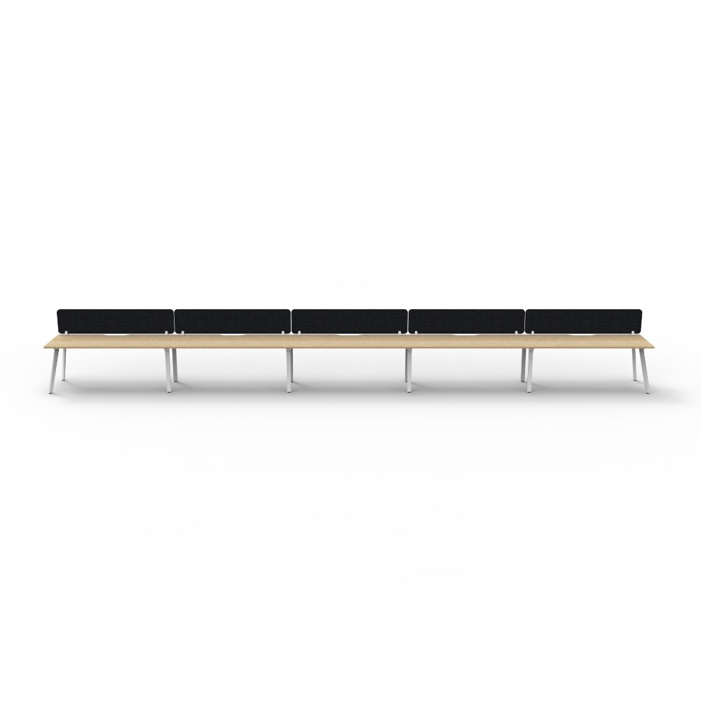 • 5 person single sided workstation with Natural Oak top and White Satin frame, Black Eco screen.