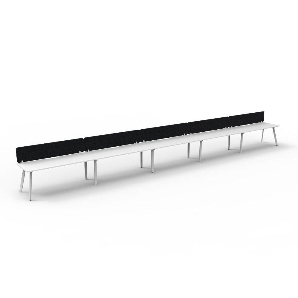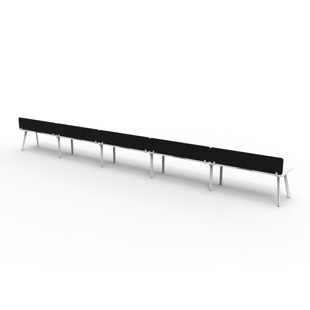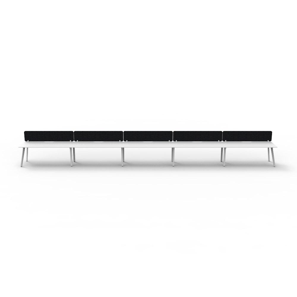 • 5 person single sided workstation with Natural White top and White Satin frame, Black Eco screen.