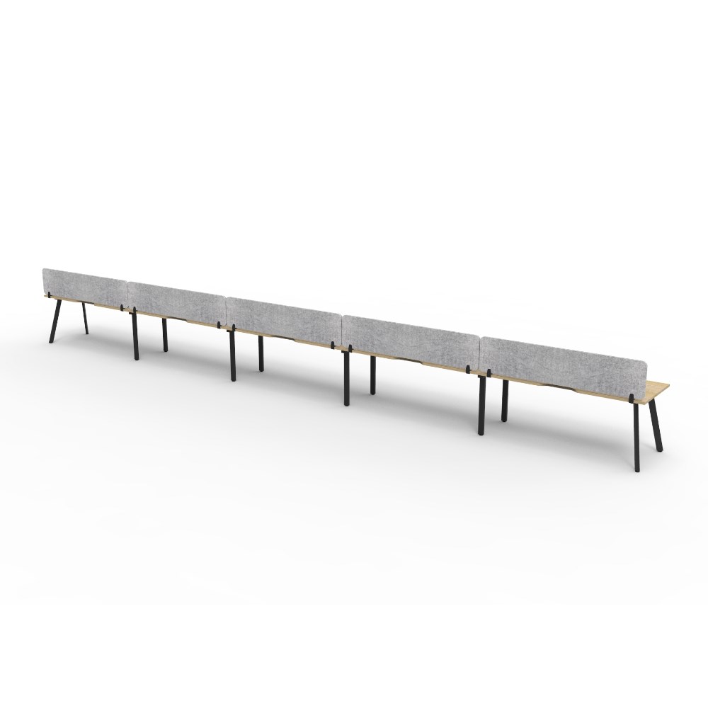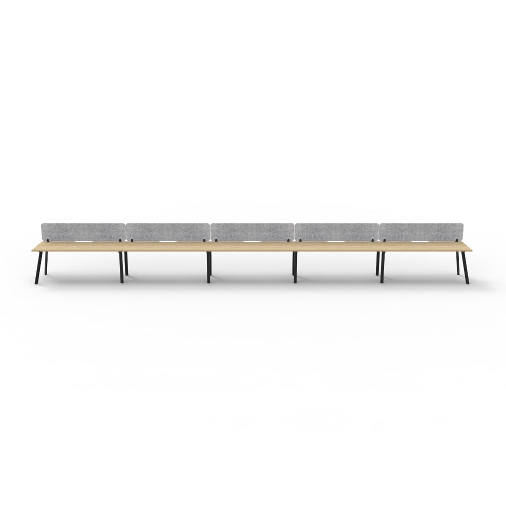 • 5 person single sided workstation with Natural Oak top and Black Satin frame, Grey Eco screen.