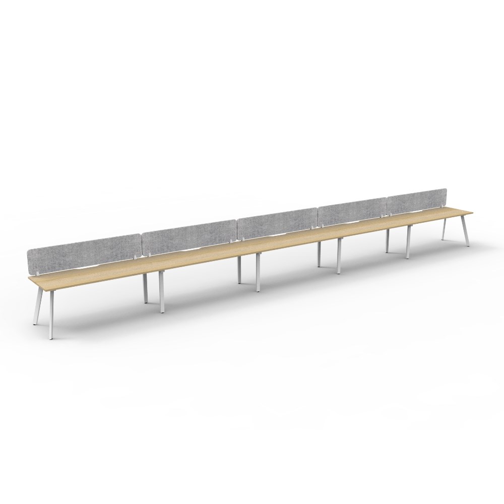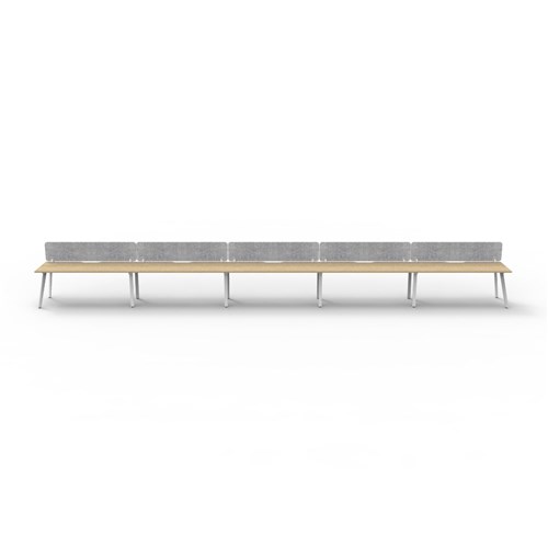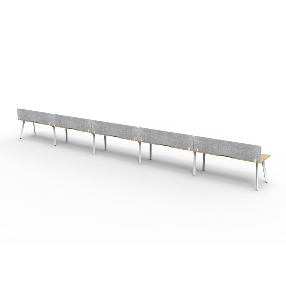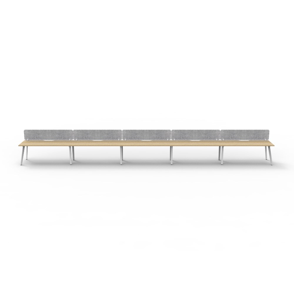 • 5 person single sided workstation with Natural Oak top and White Satin frame, Grey Eco screen.