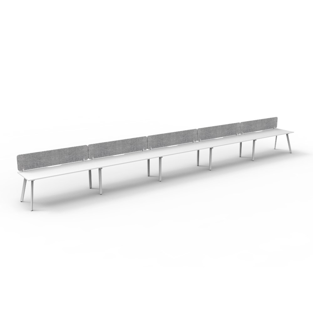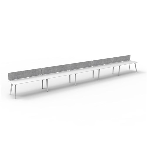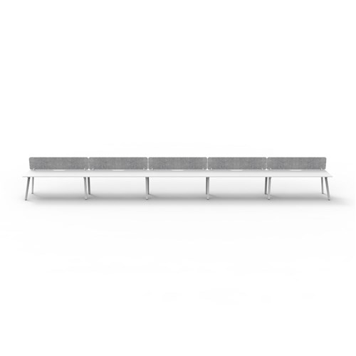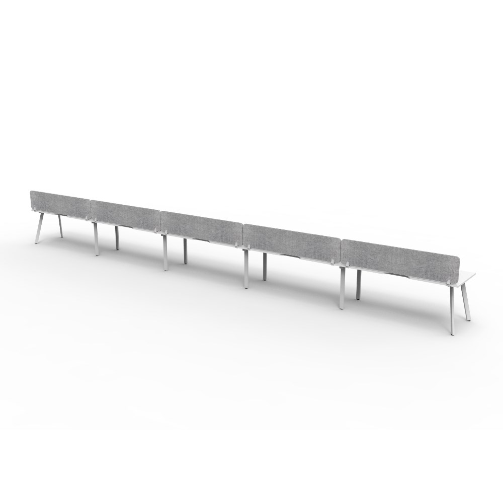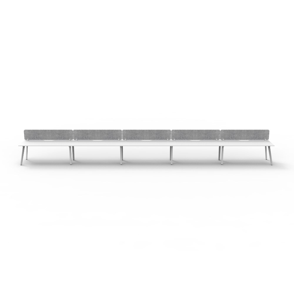 • 5 person single sided workstation with Natural White top and White Satin frame, Grey Eco screen.