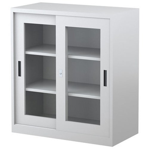 Steelco Sliding Glass Door Cupboard 2 Shelves 914W x 465D x 1015mmH White Satin
